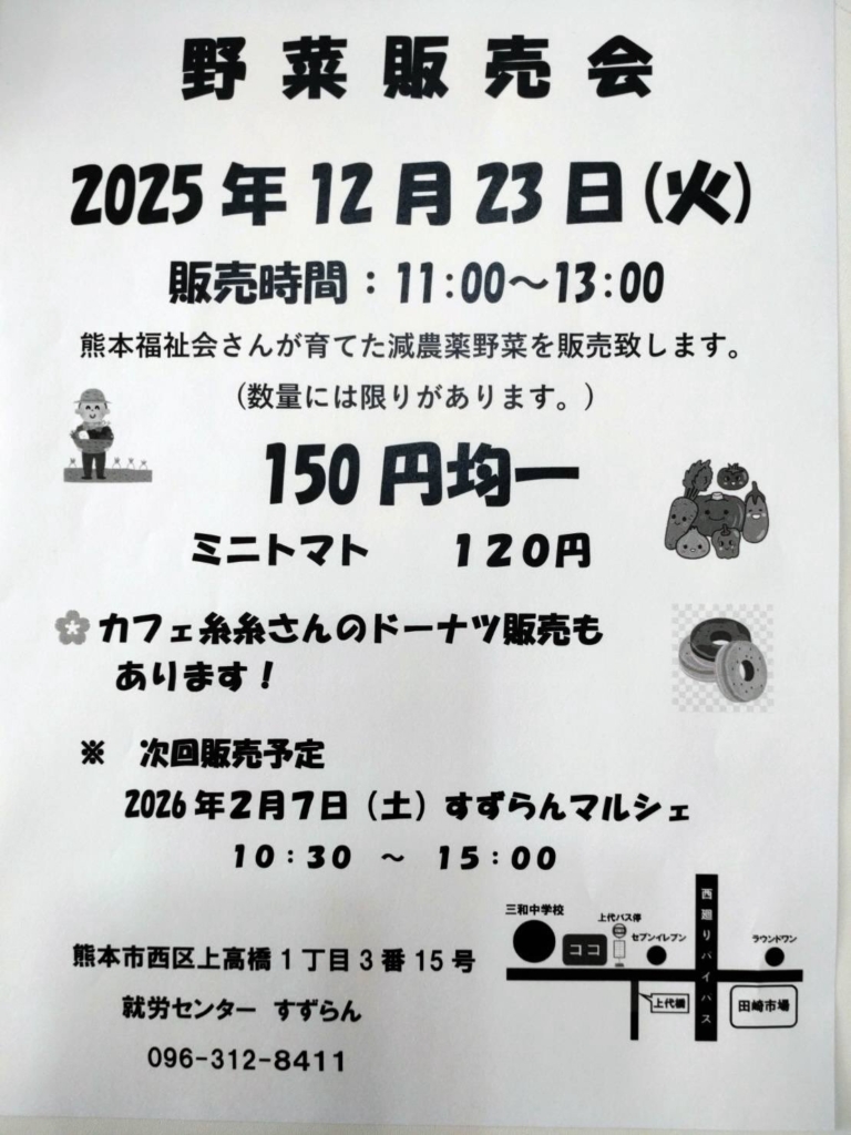 本日、 就労センターすずらん さまで 野菜販売会があります🥦✨ 11:00〜13:00 かふぇ絲のドーナツ🍩も販売します💕 お近くの方はぜひ🤗✨ #野菜が安い #熊本市 #西区 #ドーナツ #福祉 (この投稿は Instagram から転記されました)