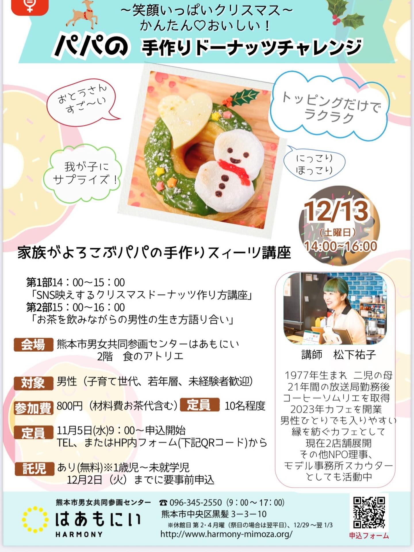 家族がよろこぶパパの手作りスィーツ講座 ~笑顔いっぱいクリスマス~かんたん♡おいしい! パパの手作りドーナッツチャレンジ 【日時】2025年12月13日(土)14時~16時 【場所】熊本市男女共同参画センターはあもに...